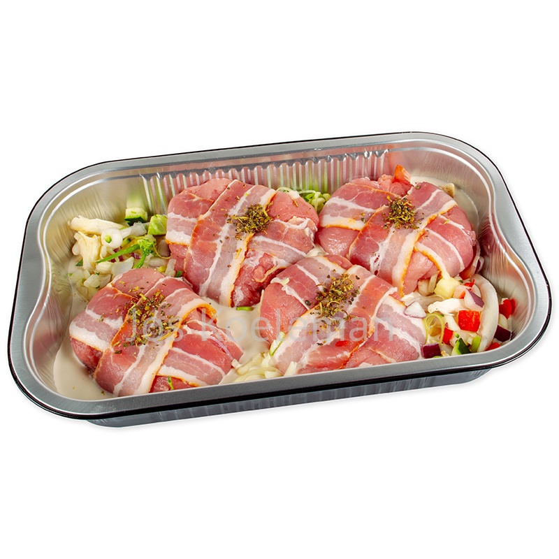 4 Boterzachte medaillons omwikkeld met mager spek, in een romige champignonsaus met groenten Bereiding 20-25 minuten in de oven op 175° Geschikt voor 2 Personen Allergenen info: Noten